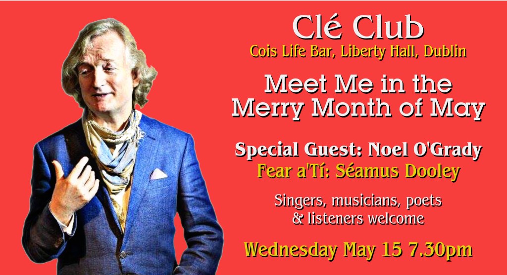 Meet me in the merry month of May with special guest Noel O’Grady. Fear a’tí Séamus Dooley will also welcome singers, musicians and poets from the floor. Attentive listeners are always welcome, too.