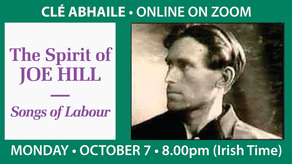 The Clé Club’s monthly online Zoom session – Clé Abhaile – will mark the 135th anniversary of the birth of the outstanding labour organiser, Joe Hill. Emigrating to the US from Sweden, Hill became an union activist with the Industrial Workers of the World – and was renowned as a composer of labour songs often satirical in tone. Hill was well known to Irish labour leaders, like Jim Larkin and James Connolly. Joe Hill’s execution in 1915 on the basis of a trumped up murder charge not only confirmed his legendary status within the labour movement but also inspired the classic anthem, “I dreamed I saw Joe Hill last night.”