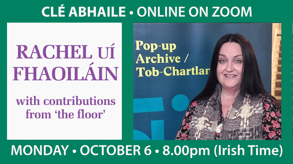 Rachel Uí Fhaoláin will be the featured performer at the next Clé Abhaile session on the Zoom platform. One of the organisers of the North Wexford Traditional Singing Circle in Gorey, Rachel is not only an acclaimed singer but also a writer, collector, researcher and publisher of songs – both traditional and newly composed. Rachel has developed a variety of initiatives aimed at stimulating the creation and transmission of songs among groups ranging from primary school children to the residents of homes for the elderly.