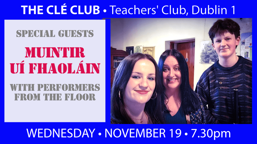 Acclaimed singers and multi-instrumentalists, Éire Ní Fhaoláin and Chulainn Ó Faoláin, from Gorey, along with mum, Rachel, herself a highly respected singer, collector, researcher and educator, will be the special guests at the November session of the Clé Club.